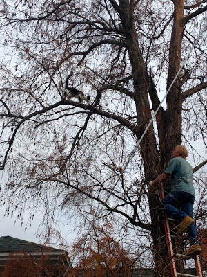 On the one hand I was relieved that it wasn't a kitten and perturbed on the other that the neighbors were scrambling up my tree that nearly caught fire the night before almost forcing the cat to it's death either by smoke inhalation or suicide. Harrowing moments from the scroungy neighbor who teetered on the tips of the flimsy ladder reaching for a cat that was obviously enjoying it's moment in the news. It walked out to the furthest edges of the branches followed by a loud crack with the cat dangling from the broken remains then looked to make sure everyone was paying attention. ATTENTION WHORE!